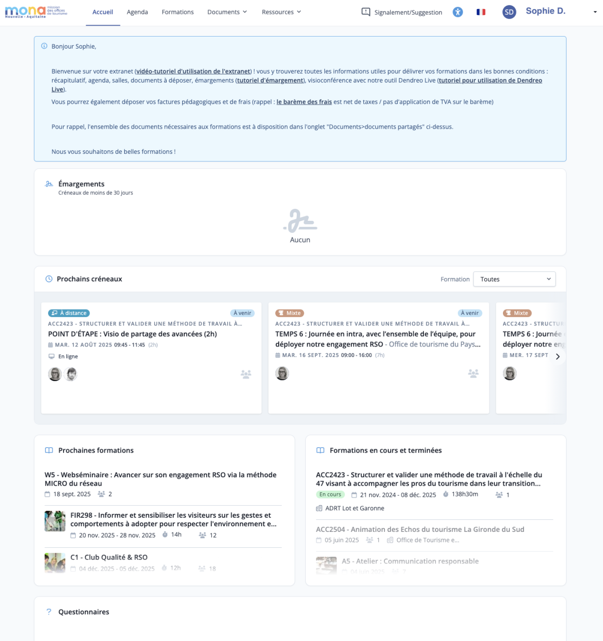 Une fois inscrit·e à une action de professionnalisation, vous disposerez d’un extranet personnel. Un espace individuel sur lequel vous retrouverez : émargements, outils de visioconférence pour suivre vos formations en distanciel, supports de formation, dossiers partagés avec le·la formateur·ice et le groupe, rappels de l'agendas des formations, suivi qualité…
