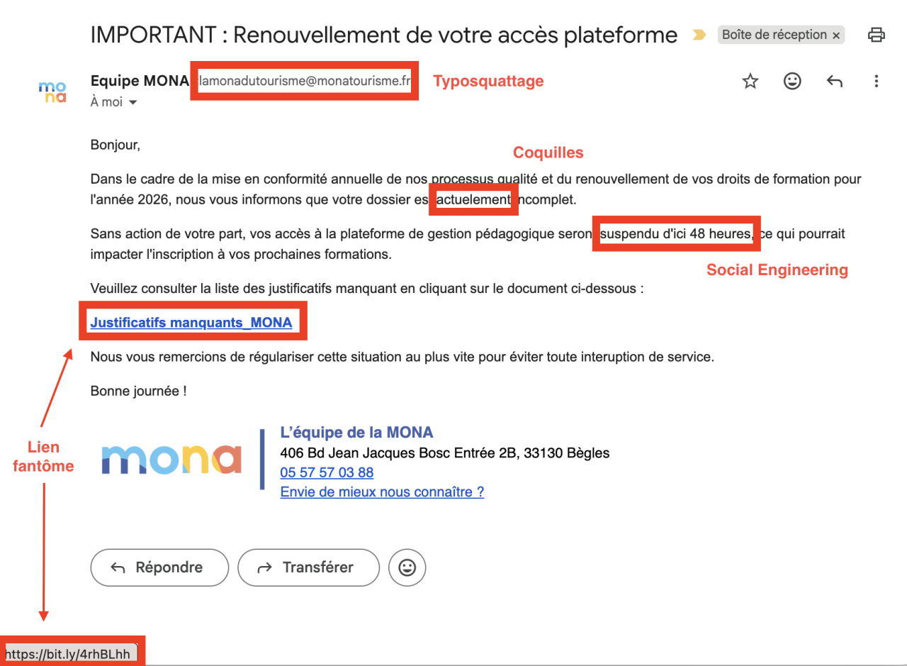 Des fautes comme "actuelement", "justificatifs manquant" sans l'accord ou "interuption" s'étaient glissés dans le texte. Souvent, les pirates utilisent des outils de traduction ou des scripts automatisés. Si une structure sérieuse comme la nôtre peut faire une faute de frappe, trois fautes dans un mail court sont un signal d'alarme majeur.