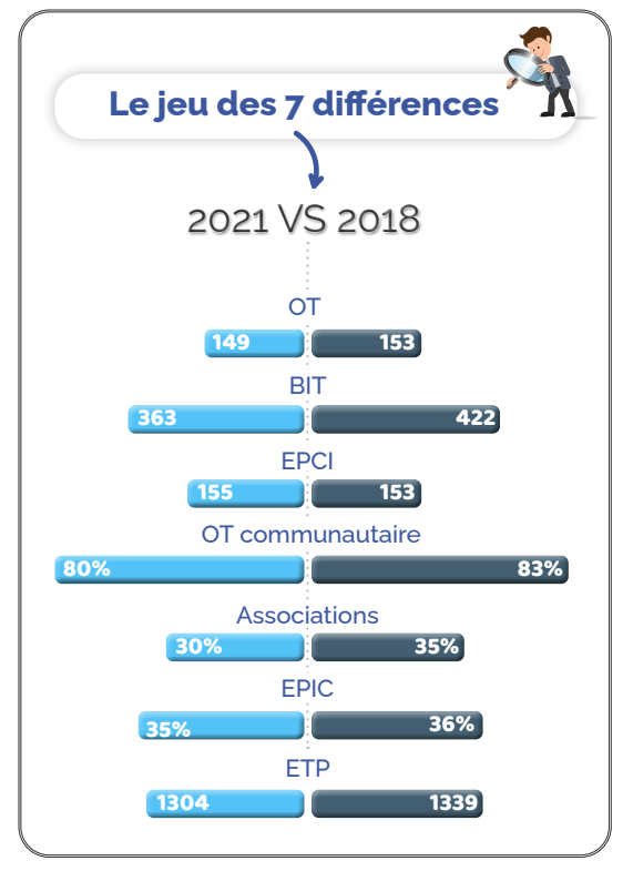 Le jeu des 7 différences nous fait suivre l’évolution du réseau, qui est entré en phase de stabilité. 2020 a été une année clairement atypique ! Quelques regroupements se poursuivent. Et également, nouveauté, les dégroupements, à l’image de la séparation d’un office de tourisme en 3 dans la Creuse, ou encore des dissociations entre station classée et EPCI permis par la loi engagement et proximité.
