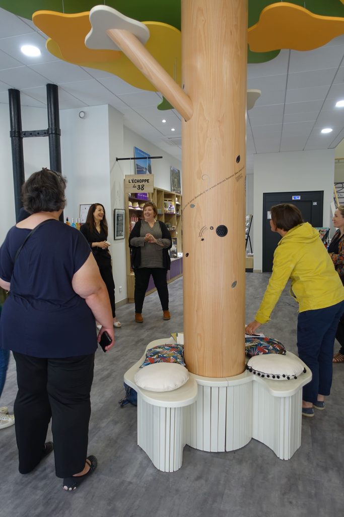 Au premier abord, l’office de tourisme peut surprendre. L’enseigne « Destination Agen » surplombe une vitrine qui emprunte davantage aux codes des Starbucks Cafés qu’à ceux des offices, brouillant un peu les pistes. En poussant la porte, on tombe nez à nez avec un camion Citroën, réminiscence heureuse des épiceries ambulantes d’antan, que les moins de vingt ans ne peuvent pas connaître… Le foodtruck, bien achalandé, fonctionne comme un produit d’appel et invite à découvrir L’Echoppe du 38, aux produits majoritairement sourcés auprès de producteurs locaux. Au centre de l’espace d’accueil, un drôle de feuillu a pris racine : « l’Arbre aux palabres », clin d’œil aux lieux de rassemblement et de transmission orale des villages africains. Adossez-vous à son tronc, tous vos sens en éveil. Vous entendrez le récit d’un « griot » agenais à l’accent d’ici et humerez le parfum de la prune. Des senteurs, des voix…, composent un patchwork subtil et onirique du territoire. Le projet est en cours d’affinage.