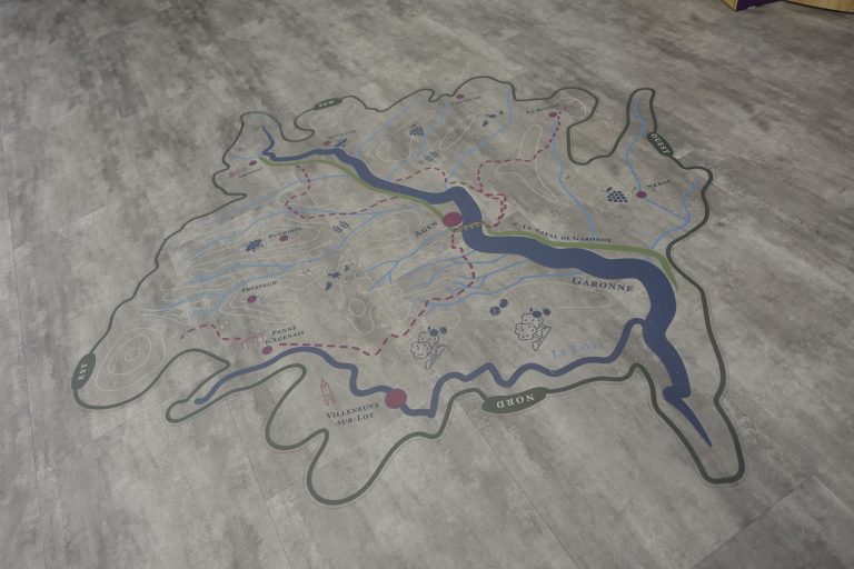 L’Office de tourisme d’Agen reçoit environ 20 000 visiteurs par an. Ce flux modéré permet de faire de l’accueil très individualisé et du conseil engagé dans un endroit cosy. / La carte touristique au sol, un outil de médiation.