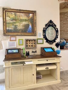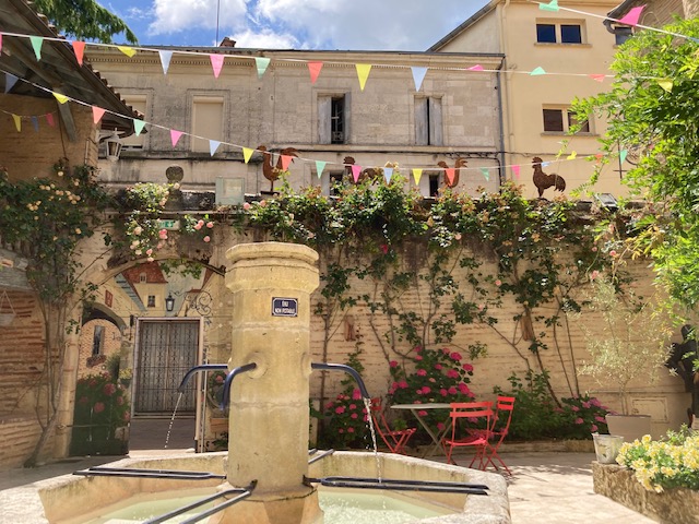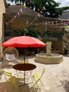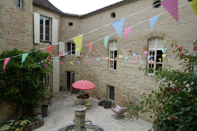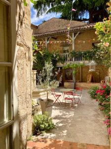Dans le patio, quelques tables et chaises invitent à se poser après la visite.