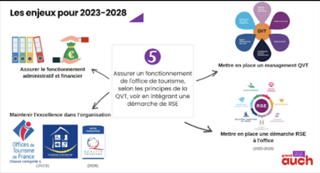 2022/2023 – Le schéma de développement touristique de l’agglomération (2023-2028) a acté que l’office devait fonctionner selon les principes de la QVCT et se fixant l’intégration d’une démarche RSE comme objectif.