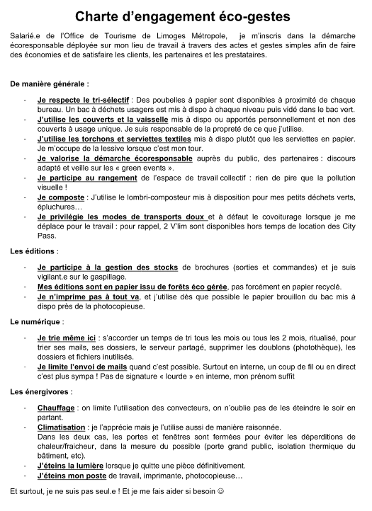 L’équipe aussi est engagée et a concrétisé ses actions en rédigeant une charte interne d’engagements écogestes. Affichée dans les locaux, elle encourage à contrôler ses stocks de brochures, ses impressions, recycler ses déchets, favoriser le covoiturage, limiter l’usage de la climatisation/chauffage, limiter l’envoi de mail, ranger pour limiter la pollution visuelle, etc.