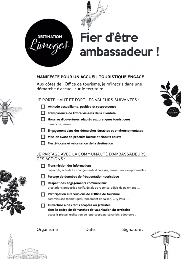 Différents supports ont été co-rédigés par l’équipe de l’Office de tourisme et les socio-professionnels. La charte Ambassadeur « Manifeste pour un accueil engagé sur la Destination » permet aux professionnels présents sur la destination de s’identifier sur des valeurs communes mais aussi de se faire connaître afin que l’accueil sur le territoire soit de même qualité, que l’on aille dans un restaurant, un hébergement ou un site de loisirs. L’éco-responsabilité est une des valeurs fortes inscrites sur la charte et le guide Ambassadeur.