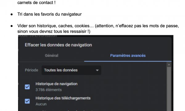 - Suivre la trame pour avoir la méthode de tri : sur internet, sur l’ordinateur en lui-même, sur ses archives et sur ses contacts