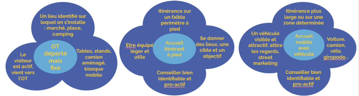 - aller là où se trouvent les visiteurs pour : permettre un meilleur maillage du territoire en termes d’accueil et de diffusion de l’information : couvrir les zones blanches et apporter un dispositif d’accueil supplémentaire / complémentaire pour accueillir les touristes là où ils se trouvent et là où on est sûr que l’on touchera les visiteurs : mieux répondre aux visiteurs