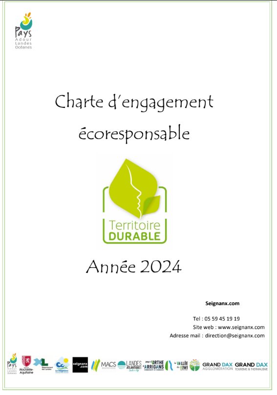 En 2024, le PETR Adour Landes Océanes a mis en place une charte d’engagement responsable que l’office de tourisme du Seignanx a signée. Elle s’inscrit dans la démarche Tourisme Durable qui est menée de manière partenariale entre offices de tourisme, intercommunalités, le PETR et les partenaires touristiques intéressés. Ainsi, les signataires s’engagent à respecter 10 critères déclinés en 26 actions (cf. charte d’engagement écoresponsable 2024).