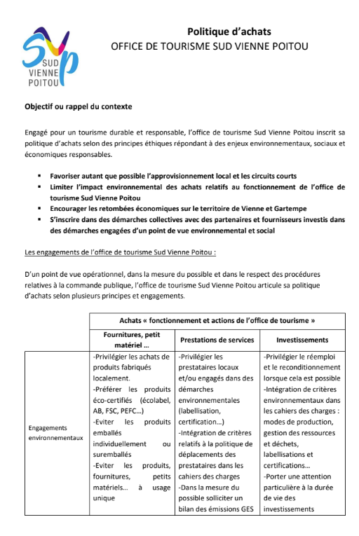 - Limiter l’impact environnemental des achats relatifs au fonctionnement de l’office de tourisme Sud Vienne Poitou