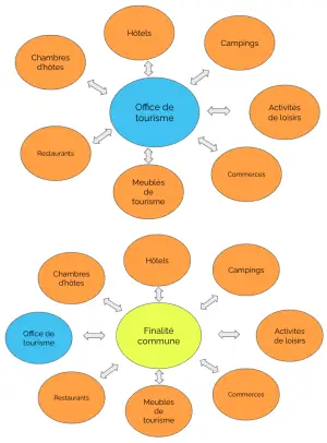 Ce qui semble être d’une facilité évidente demande cependant un effort de positionnement sur son territoire touristique, qui n’est pas anodin. L’OT, pour ce cas de figure prévis, accepte de passer d’un schéma (A) à un schéma (B).