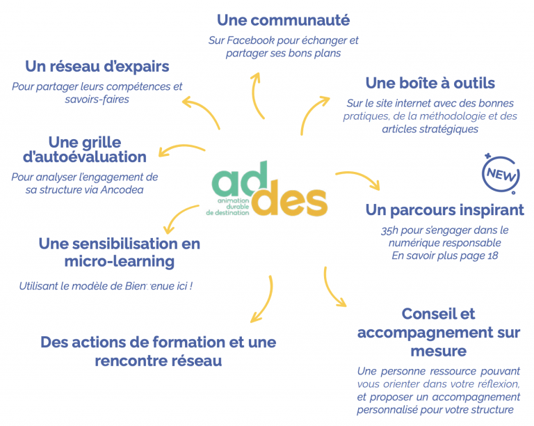 ADDES pour Animation Durable des DEStinations, est un programme de transformation qui a pour objectif d'accompagner les offices de tourisme sur 3 ans, pour prendre en main leur stratégie de tourisme durable autour des six thématiques dégagées lors du NADOT19. Ce programme se décline en différents outils et formats afin que chacun·e puisse y trouver satisfaction.