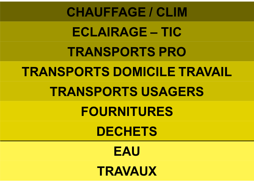 L’image, proposée sur votre gauche, représente les 9 principaux postes d’émissions de gaz à effet de serre hiérarchisés selon leur niveau d’émission. Le chauffage/clim étant le plus important.