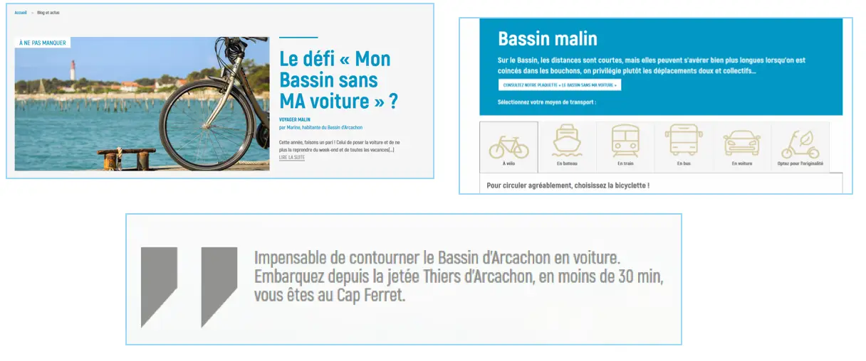 Le travail du SIBA cible d’une part la clientèle touristique avec la création par exemple d’un mobil first permettant le calcul d’itinéraire en vélo. Une carte des déplacements (à pied, à vélo, en bateau est accessible facilement) et une mise en avant de message incitatif inonde les supports de communication.