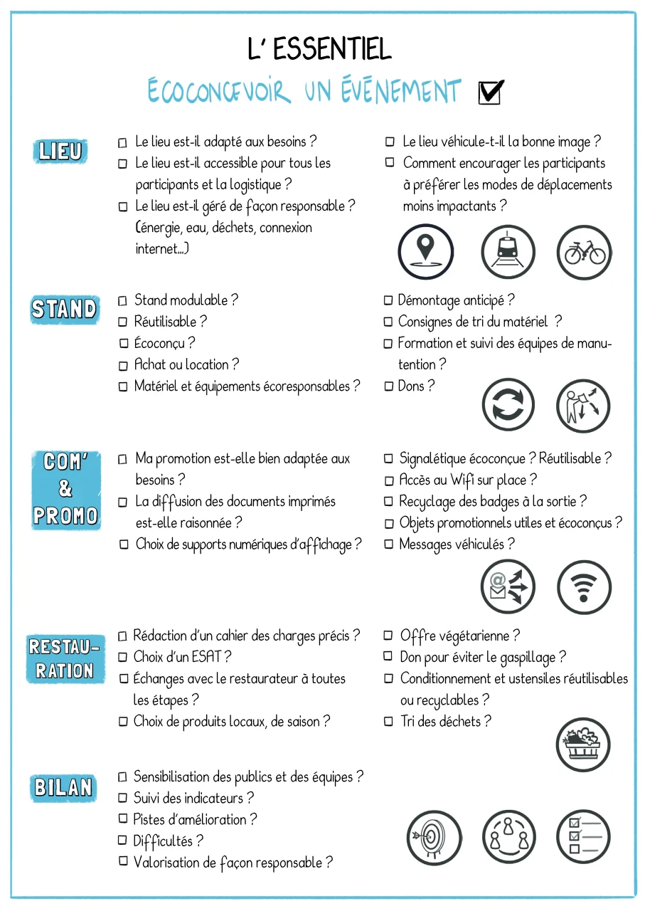 Concevoir un événement durable c’est agir à toutes les étapes d’un événement : de la réflexion, en passant par l’organisation puis le bilan. C’est aussi agir sur toutes les thématiques : mobilité, déchets, énergie, eau, alimentation, biodiversité, accessibilité… L’ADEME a regroupé les différentes questions à se poser et les différentes étapes indispensables pour éco-concevoir un événement et que vous pouvez retrouver via l’infographie ci-jointe ou sur le site internet dédié.
