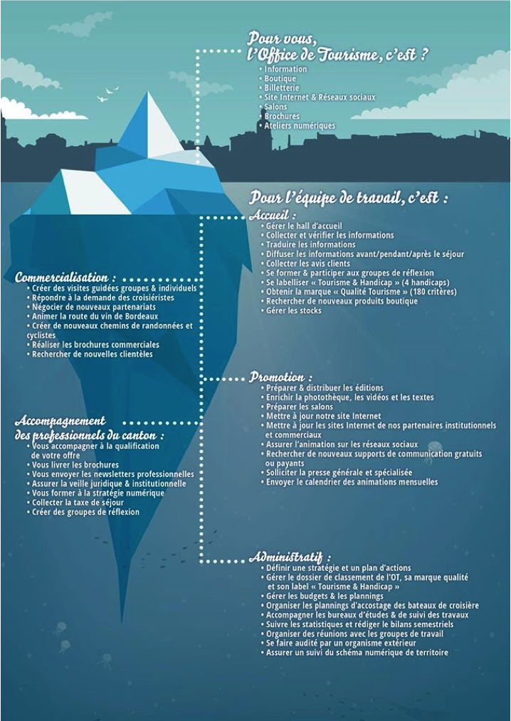 L’Office de tourisme de Bourg sur Gironde utilise dans sa communication l’image de l’iceberg pour décrire et faire connaître son rôle et ses missions auprès de ses acteurs locaux.