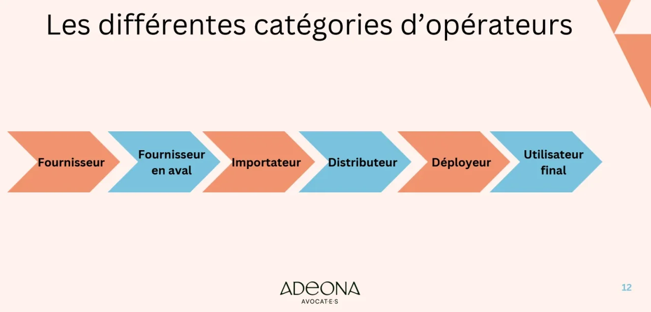 - Distributeur : « une personne physique ou morale faisant partie de la chaîne d’approvisionnement, autre que le fournisseur ou l’importateur, qui met un système d’IA à disposition sur le marché de l’Union »