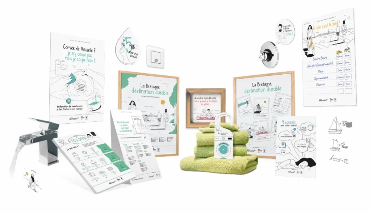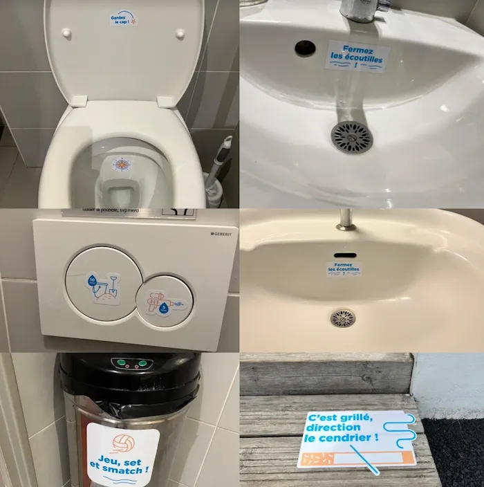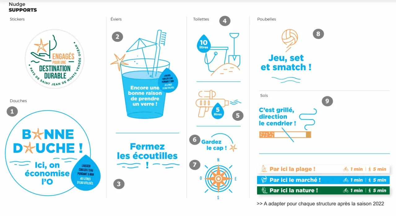 A partir de ces contenus, l’office a travaillé avec une agence de communication pour créer des supports se basant sur le nudge et l’identité du territoire (la plage, le littoral, le balnéaire…). Les partenaires ont ainsi pu installer les différents stickers au sein de leur activité et les retours pour la première saison d’application étaient très positifs notamment de la part des enfants ou sur les thématiques en lien avec l’eau suite aux pénuries de l’été.