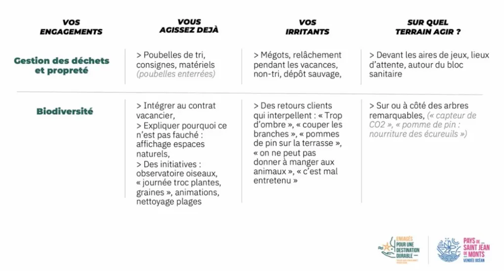 En 2022, le thème commun de ce groupe de travail était de savoir comment impliquer les clientèles à réaliser des actions favorables pour l’environnement. Pour cela, un premier axe a été de réaliser un atelier de travail pour définir le type d’actions à mener, les irritants à résoudre ainsi que les différents lieux de communication. Au total 6 grandes thématiques se sont dégagées : gestion des déchets et propreté, biodiversité, limiter la consommation d’eau, limiter le bruit, propreté sanitaire et produits locaux/économie locale.