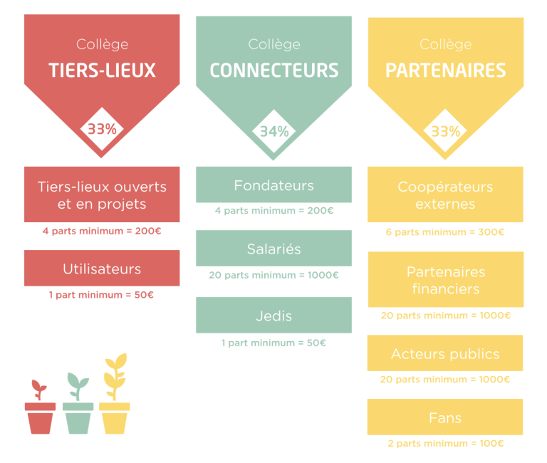 Ces associé·e·s sont réparti·e·s en catégories, constituées de personnes morales ou physiques. C'est le projet collectif qui prévaut, dans lequel chacun·e trouve un intérêt particulier.