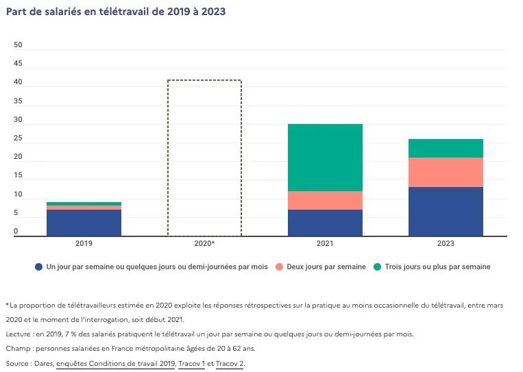 En 2024, en Nouvelle-Aquitaine, 81 offices de tourisme ont déclaré avoir rédigé des accords de télétravail, soit plus de la moitié du réseau (contre 1/3 en 2021).Source : radioscopie du réseau des OGD néo-aquitain Entre 2019 et 2023, la part des personnes salariées pratiquant le télétravail au moins occasionnellement passe de 9 % à 26 %. Source : Dares, évolution de la pratique du télétravail depuis la crise sanitaireLe Télé-Scope, observatoire du télétravail en Nouvelle-Aquitaine, a été inauguré par l’Aract Nouvelle-Aquitaine en septembre 2021 et permettra d’observer les pratiques dans la durée.
