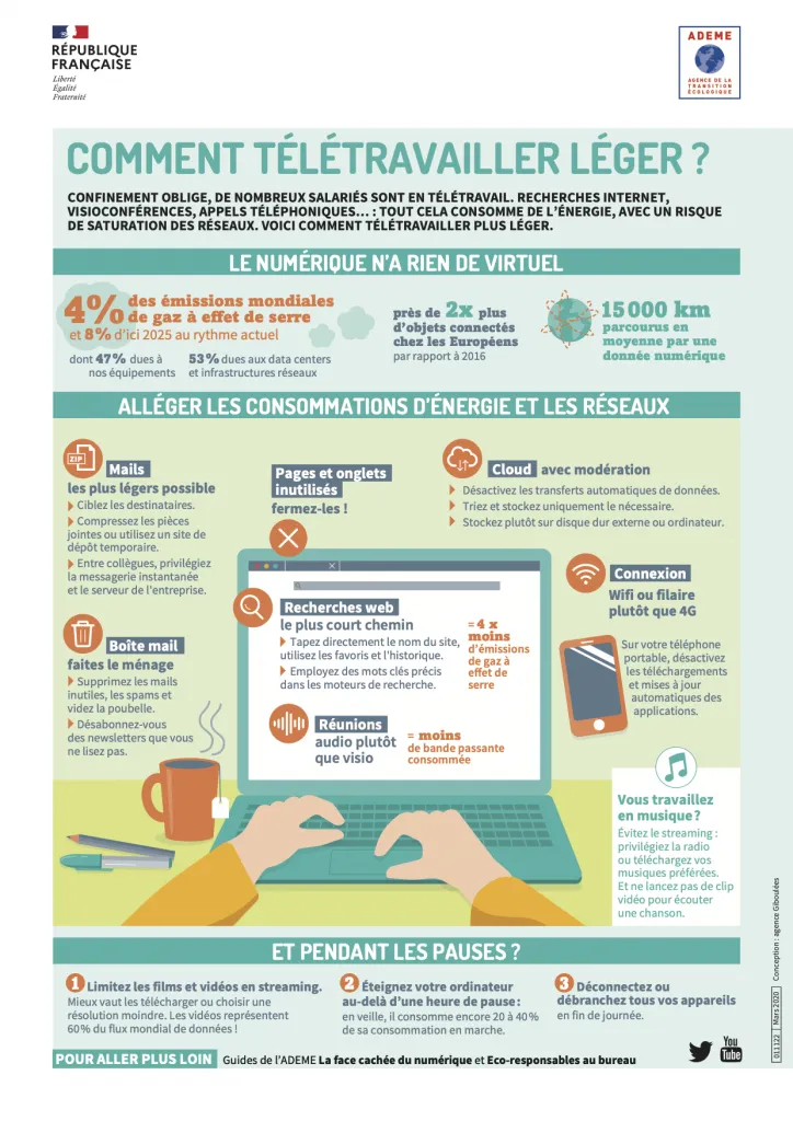 Découvrez ci-contre une infographie de l’ADEME avec toutes les bonnes pratiques pour télétravailler léger. Retrouvez également plus de conseils sur numérique et durable.