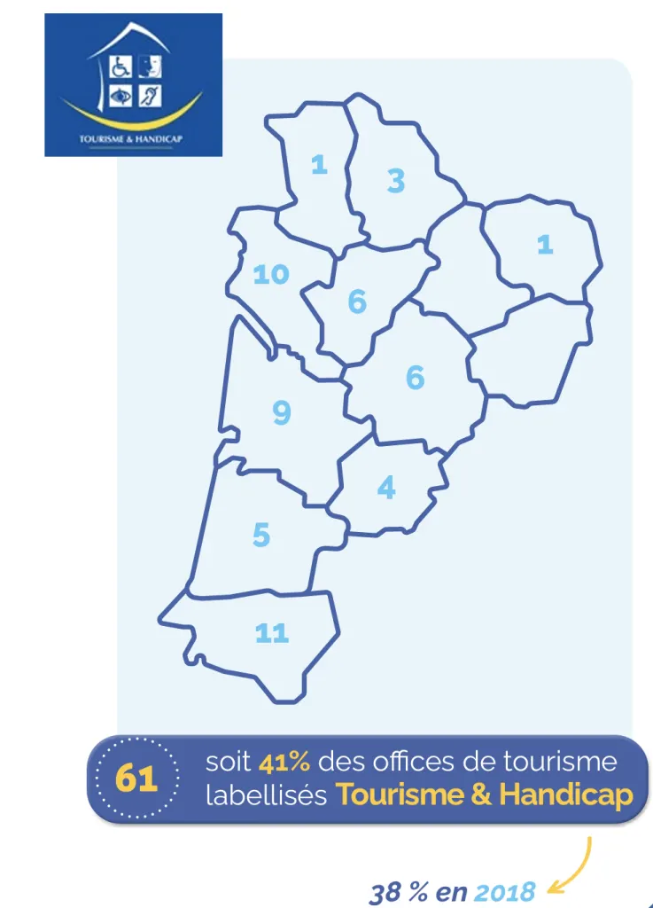 Dans la radioscopie du réseau des offices de tourisme, nous avons fait le tour des offices de tourisme qui possèdent la marque Tourisme & Handicap. Toujours un beau palmarès pour la Région Nouvelle-Aquitaine. 41% du réseau des Offices de tourisme de la région sont labellisés en 2021 soit 3 point de plus qu’en 2018.