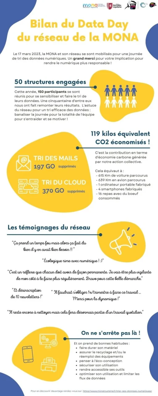 Le 17 mars 2023, le second data-day du réseau a réuni 150 participants, soit une cinquantaine de structures du réseau ! Au total 567 GO de données mails et fichiers cloud ont été supprimées des serveurs, soit près de 119 kg équivalent CO2 ! Encore une belle action pour réduire la pollution numérique !