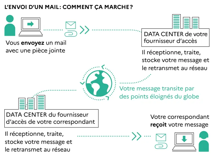 Cela ne s’arrête pas là, car les données ne sont pas stockées uniquement de façon locale, c’est-à-dire sur vos appareils. Elles sont de plus en plus stockées en ligne, sur des « clouds » qui ne sont ni plus, ni moins que des unités de stockage (aussi appelées Data Center) reliées en réseau et fonctionnant en permanence pour permettre un accès 7/7 jours et 24h/24h à toutes les données. Derrière un fonctionnement qui paraît virtuel, il y a une réalité bien matérielle avec des espaces de stockages qui contiennent des équipements informatiques, reliés par des câbles et nécessitant de l’énergie en continue pour fonctionner. Aujourd’hui c’est 10 % de la consommation électrique qui est liée aux services numériques. A noter que ce fonctionnement est le même pour l’envoi d’un mail qui transite d’une espace de stockage à un autre comme le montre l’infographie ci-jointe.